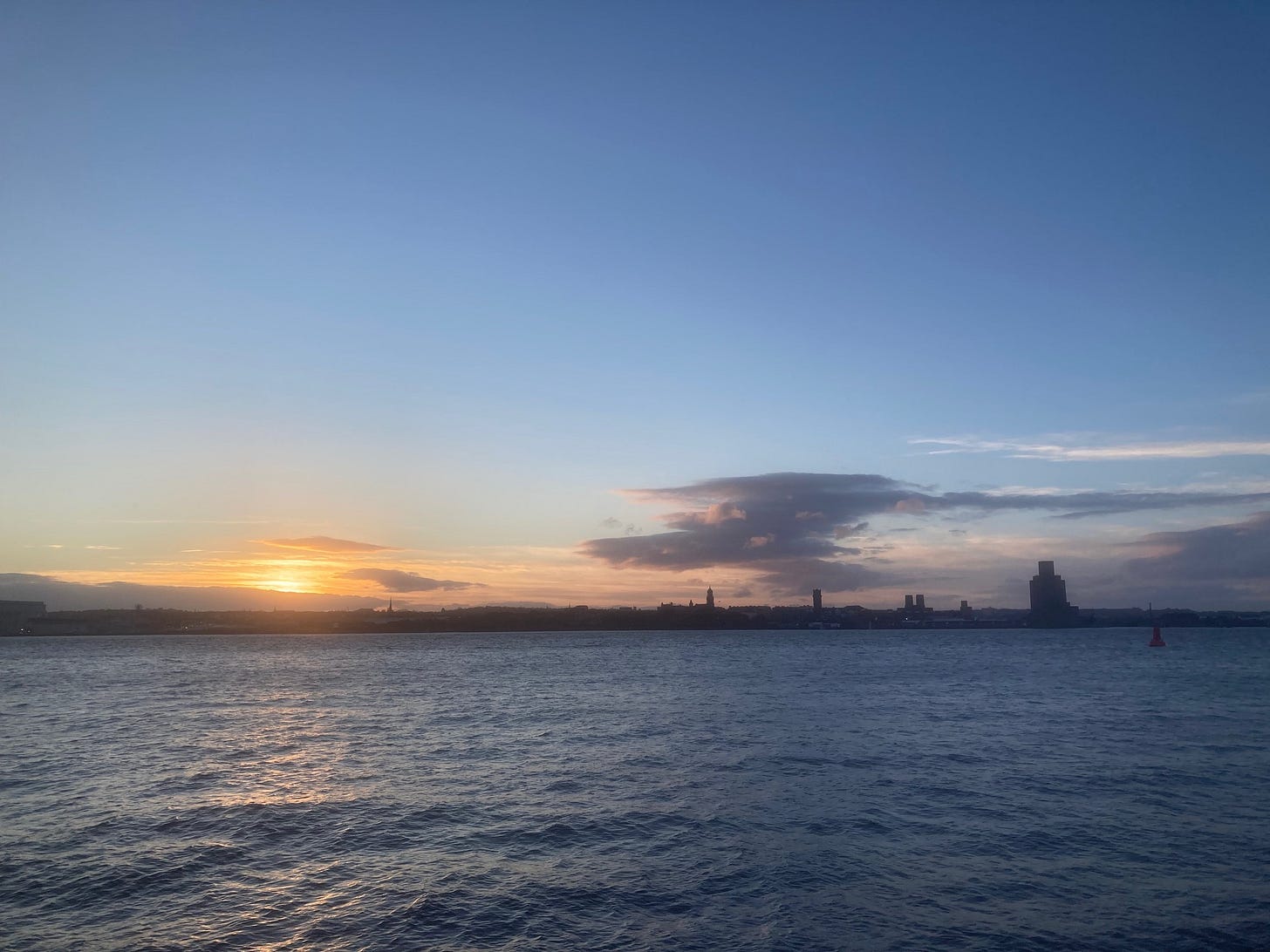 The world’s been helping with that, too, bless it. On Thursday afternoon, I made time to walk out of the venue with a cup of coffee – when you’re on tour it’s all too easy to spend all day, day after day, not seeing any natural light – and spend half an hour standing beside the river Mersey, listening to the gulls, watching ships glide upstream on an incoming tide, relaxing as the light shifted and changed, and dreaming a little as the sun slid down out of the cathedral of an eggshell-blue sky into low charcoal clouds that hugged the horizon.