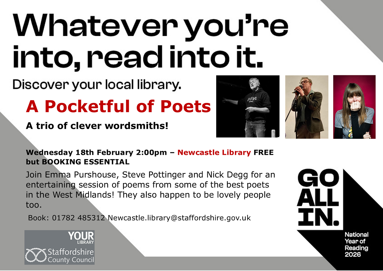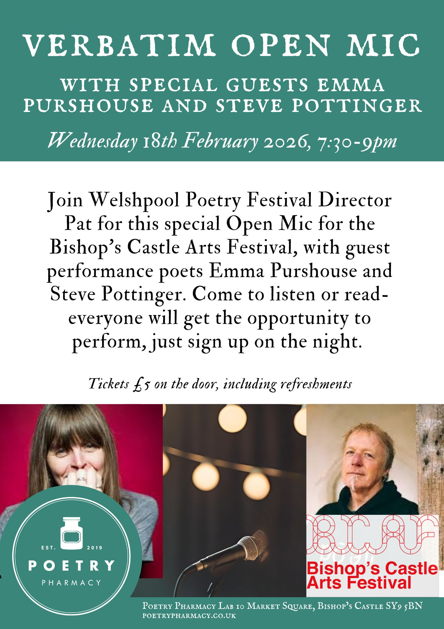 The following night, both of us are guest poets at Verbalise, in Kendal (open mic spots also available) and if you rewind to Wednesday Feb 18th, we’re doing two gigs a little closer to home. In the afternoon, we’re part of A Pocketful of Poets at the library in Newcastle-under-Lyme (2pm start, free entry, booking essential) after which we scoot across to the Poetry Pharmacy in Bishops Castle to be the feature poets at Verbatim. All the details for both these gigs are on the posters below. Gigging in February… at least I’ll get to see what rain looks like in different parts of the country. Snorkels and wetsuits optional.